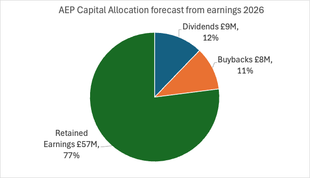 I assume that AEP earn £74M in cash in 2026, as they are estimated to have done in 2025. They have announced an £8M buyback scheme for H1 26, and are likely to pay a dividend of £9M in the year of 2026. This means that they will likely retain 77% of 2026 earnings.