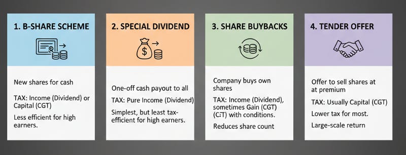 B-share scheme: this is where AEP issues new shares pro rata to existing shareholders, then pays cash to buy them back at a set price and cancels them, reducing their capital in the process. If structured correctly, this may be able to be done as a return of capital, potentially avoiding capital gains taxes. It would enable as much cash as desired to be returned.