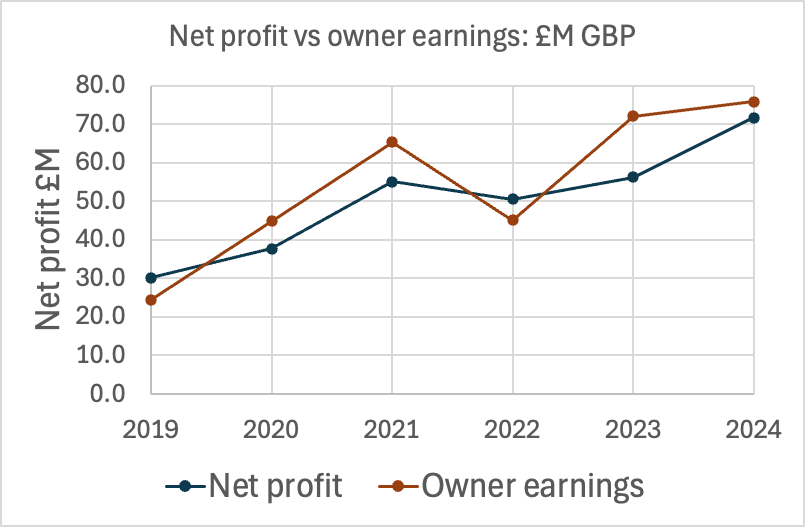 Owner earnings averaged over 2023-2024 are £74M. At the current market cap of £920M (share price 1000p), this is an owner earnings yield of 8%. Revenue CAGR has been conservatively estimated above at about 5%/year, for a total return of 13%/year. However, I expect that Gamma’s organic growth will be higher than this, because of the larger contribution from the fast growing German market: and because the German government is embarking on a massive rise in military spending due to the situation with Ukraine and Russia, which should help the German economy.