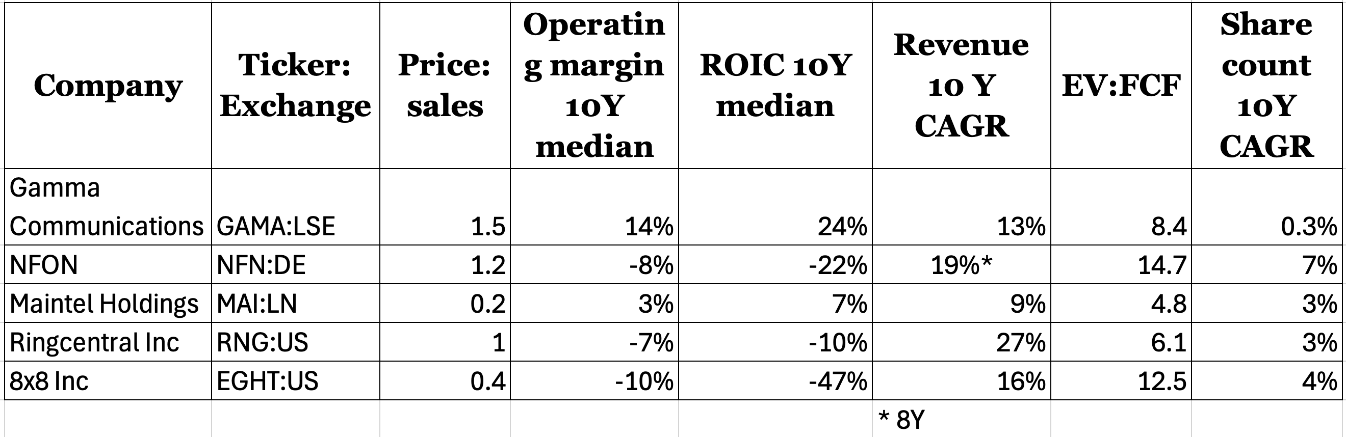 Ringcentral and 8x8 are large US-based comparators: but both have business in Europe so are also Gamma competitors. Ringcentral has a tie up with Vodafone. Both are prioritising growth over profitability, and make losses continually, though in both cases growth has been in the very low/negative single digits in the last couple of years vs teens double digit growth historically.
