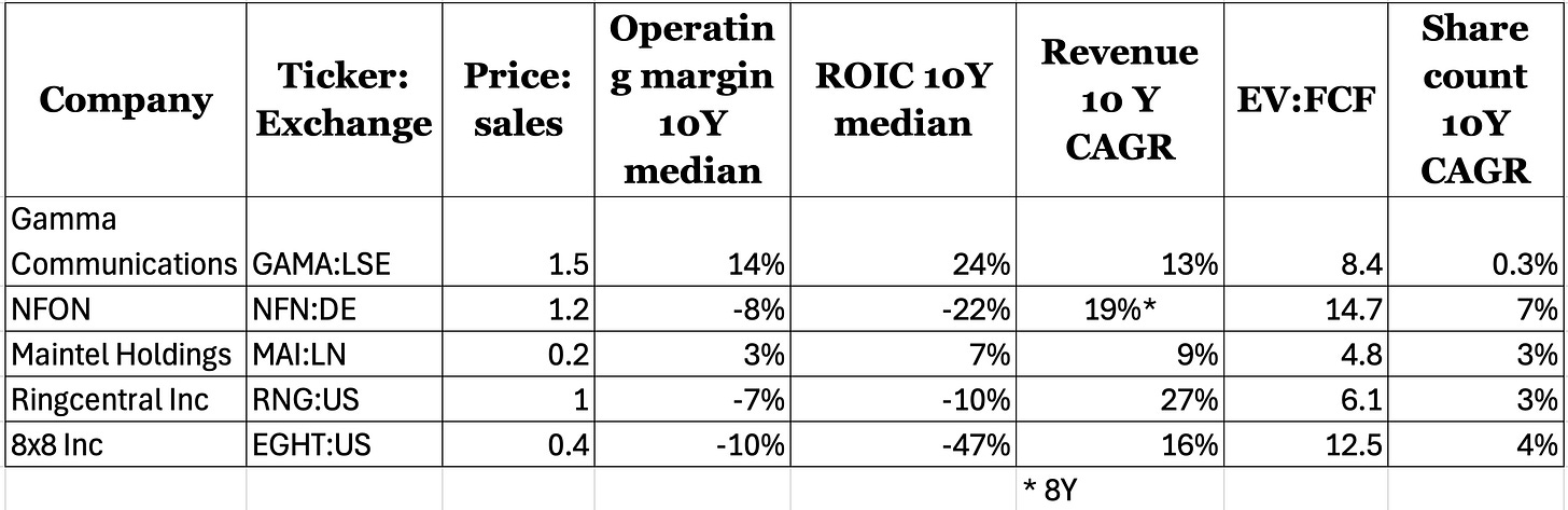 NFON is a venture capital backed, money losing UCaaS company in Germany that directly competes with Gamma. It has just broken even for the first time after breakeven after eight years of losses, and has grown mostly organically: though it did issue shares and made one acquisition a few years ago. In the 2022-2023 period revenue growth slowed to 7% then 2% respectively.
