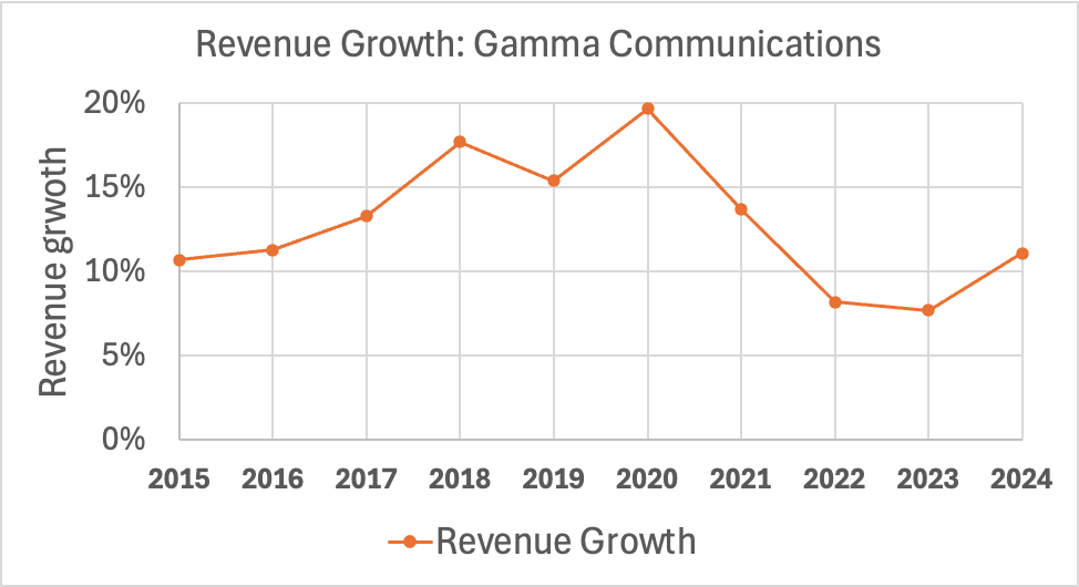 Prior to the pandemic, Gamma grew at 11%-20% a year, and in 2022-23, at 8% each year. In the case of Gamma Communications, we can conservatively assume that organic growth rate of 5% seen in 2024 will be the same going forward: which is less than the rate of 8% in 2022 and 2023.